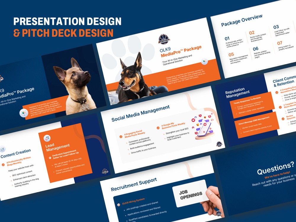 We’ll need your existing content, brand guidelines, or any reference decks you’d like us to consider. If you don’t have content, we can also provide copywriting to craft your message from scratch.